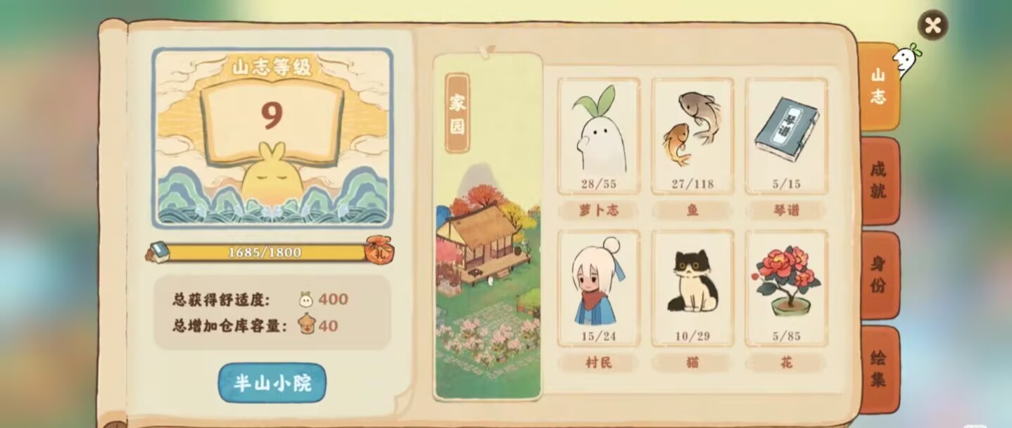 翻山志才发现,我已经解锁了15个村民、10只猫,还有28个不同的小萝卜。