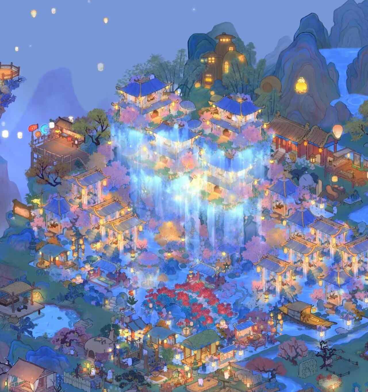 我特意在镇子中心造了一片发光花海,搭配天工建筑里解锁的戏台,晚上一整个亮起来的时候,直接截图当了壁纸
